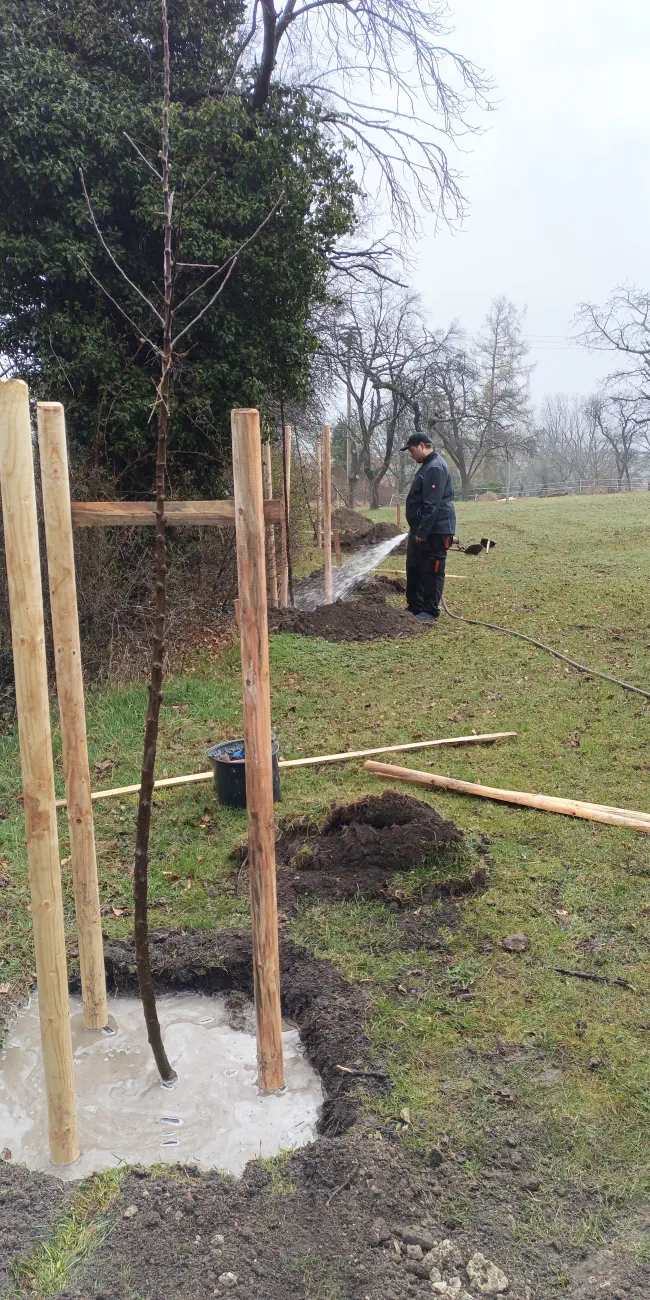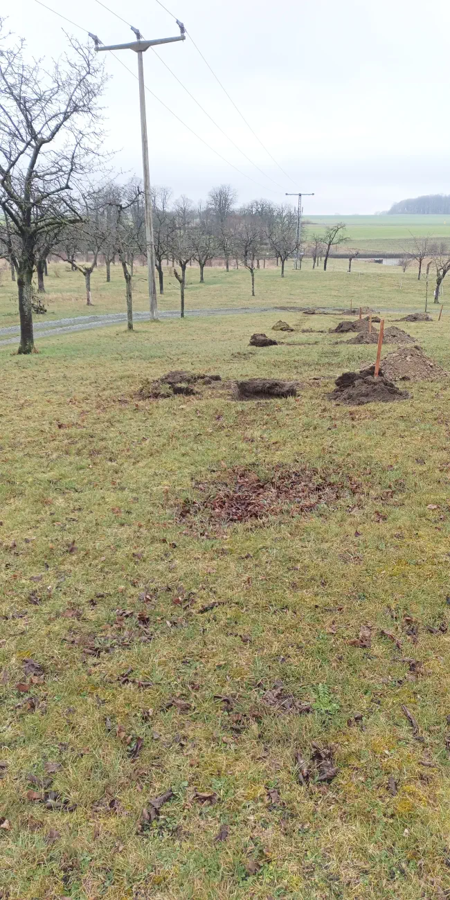 Zur Vorbereitung erhielten wir Unterstützung durch die Fa. Denis Maldet BVM, die die Pflanzlöcher mit entsprechender Technik für uns ausgehoben hat. Eine Vielzahl von Vereinsmitgliedern half die Bäume einpflanzen, zu wässern und in den Dreiböcken zu sichern.